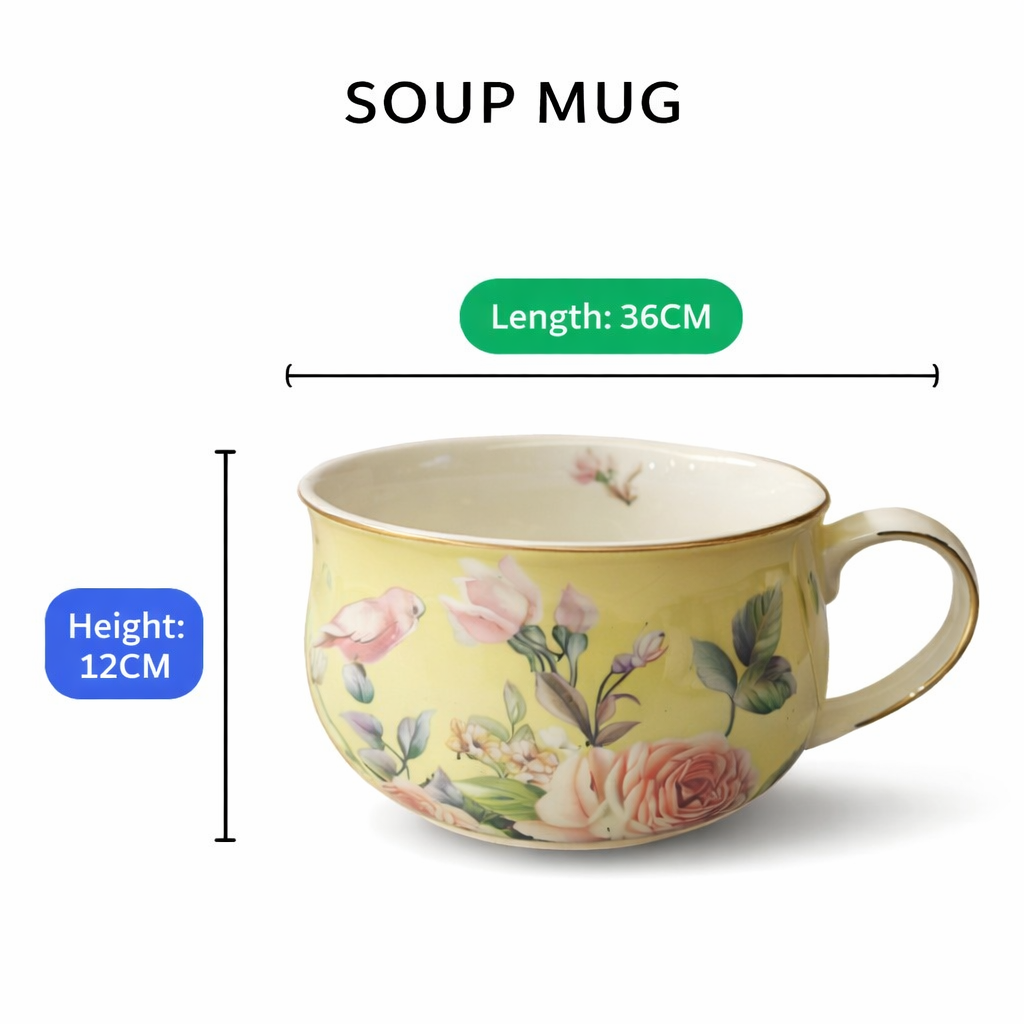 Design: Made from premium-quality ceramic, these tea cups beautifully combine style and practicality. The Golden Dawn Floral Soup Mug Set charming floral patterns reflect the calm and refreshing beauty of nature, turning each cup in the set into a visually pleasing piece. Thoughtfully designed with smooth curves and a comfortable side handle, these cups fit naturally in your hand, ensuring a pleasant and effortless tea-drinking experience.